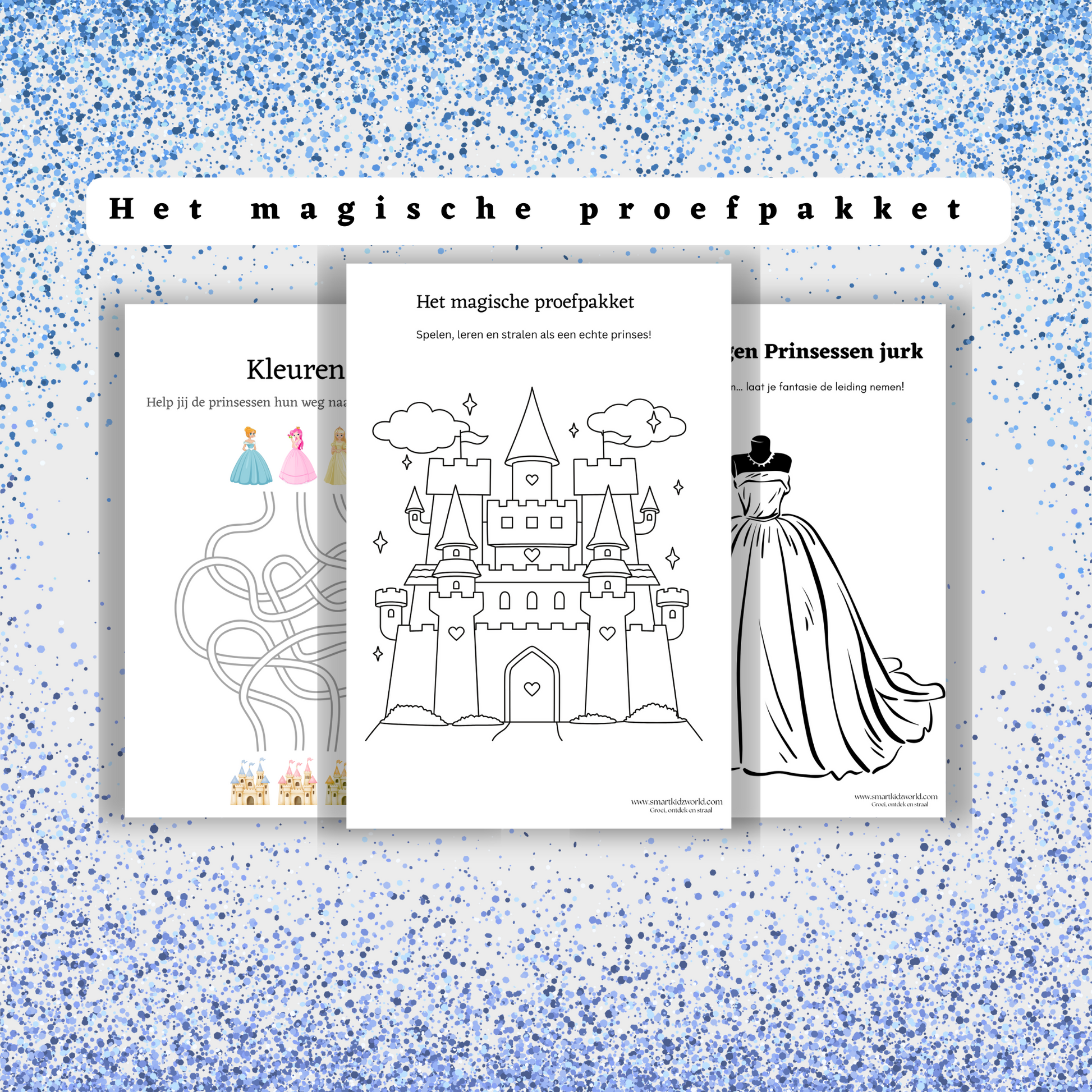 Voor slechts €5,95 ontvang je 10 prachtige werkbladen boordevol prinsessenpret. Kleurplaatjes, telspelletjes, lijnen volgen en meer – allemaal in het teken van koninklijke magie.