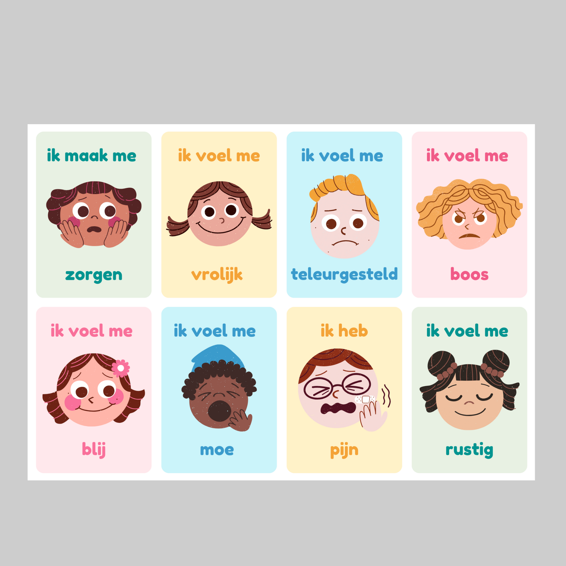 Deze kleurrijke gevoelenskaarten helpen kinderen om emoties te herkennen, benoemen en bespreken. Elke kaart bevat een duidelijke illustratie en een eenvoudig woord zoals “blij”, “boos”, “verdrietig” of “trots”. Zo leren kinderen op een speelse en veilige manier praten over hun gevoelens. Ideaal voor thuis, in de klas of bij coaching en therapie.