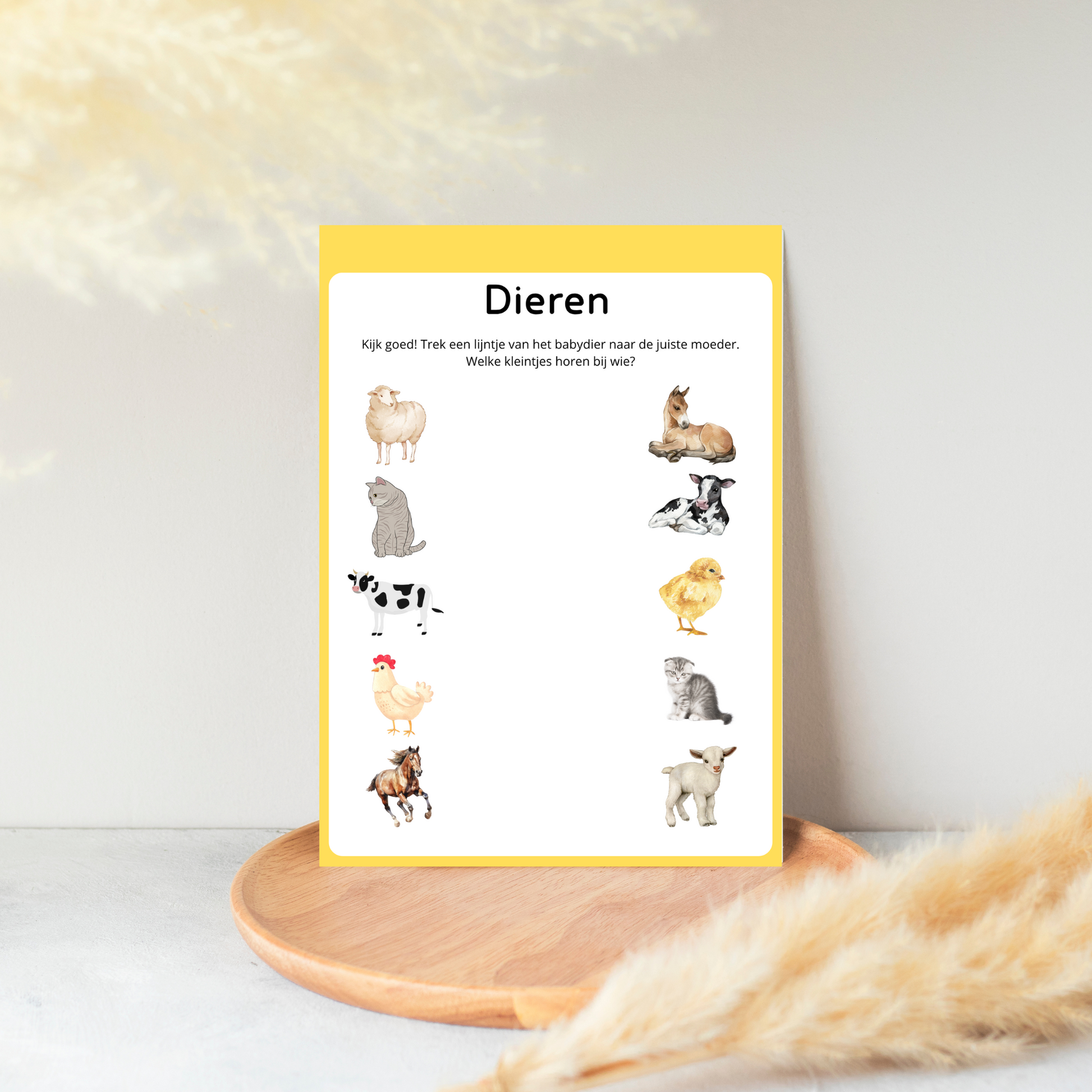 Door lijnen te trekken tussen de moederdieren en hun jongen oefenen kinderen spelenderwijs hun logisch denken, herkenning en fijne motoriek. Ideaal voor thuis, in de klas of als extra oefening onderweg!