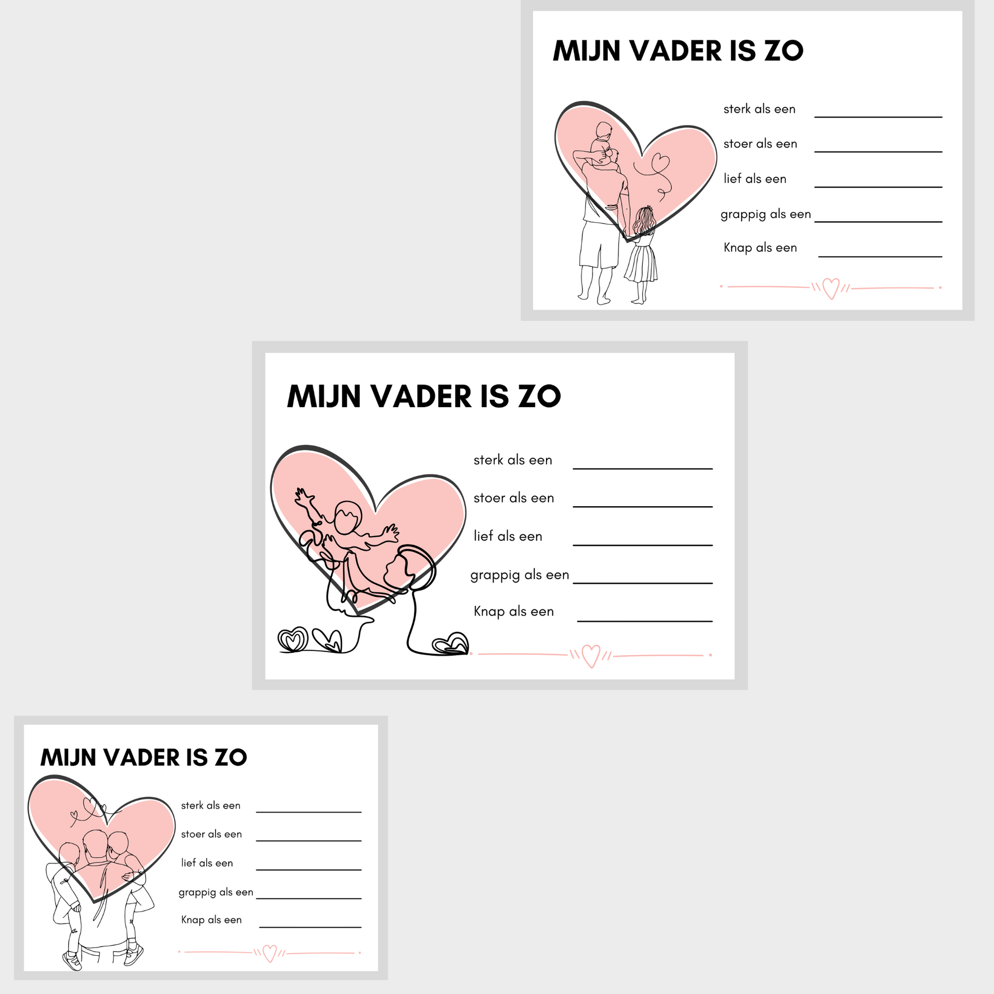 Laat je kind deze Vaderdag iets unieks en persoonlijks geven met de invulkaart “Mijn Vader is Zo…”. Dit digitale product bevat een vrolijke en liefdevolle Vaderdagkaart die kinderen kunnen inkleuren en invullen met hun eigen woorden. Of papa nu stoer, grappig, lief of sterk is – met dit kaartje laat je kind precies zien waarom hij de allerbeste vader van de wereld is.
