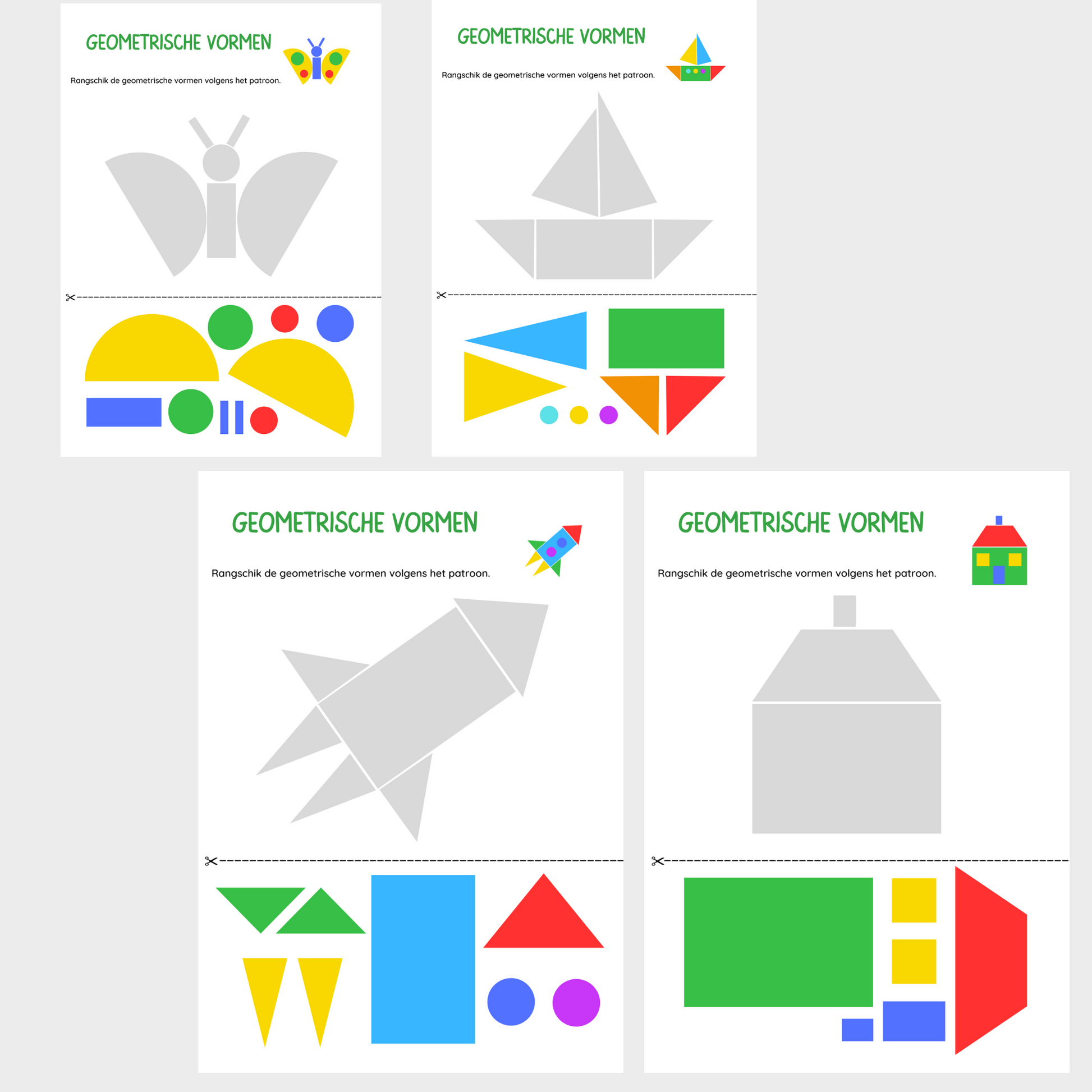 Knip de vormen netjes uit en plak ze op de juiste plek in de tekening. Kijk goed naar de vormen: welke is een cirkel, een vierkant, een driehoek of een rechthoek?