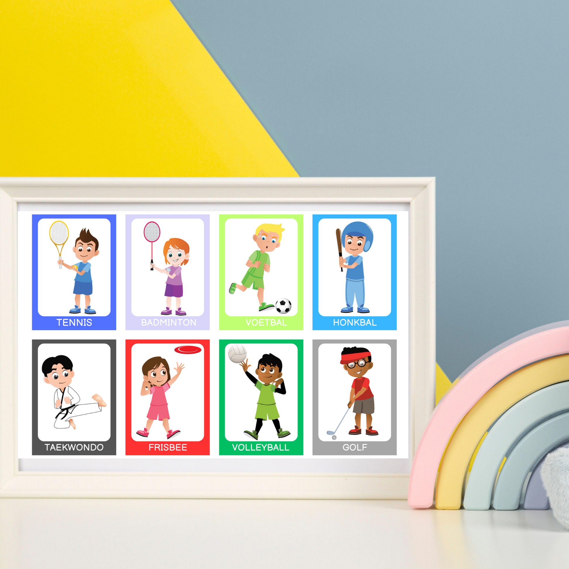 Zet je kind in beweging met deze vrolijke, digitale sportkaartjes! Elke kaart toont een herkenbare sport met een kleurrijke illustratie en duidelijke naam. Perfect om te leren over verschillende sporten én om actief mee aan de slag te gaan!