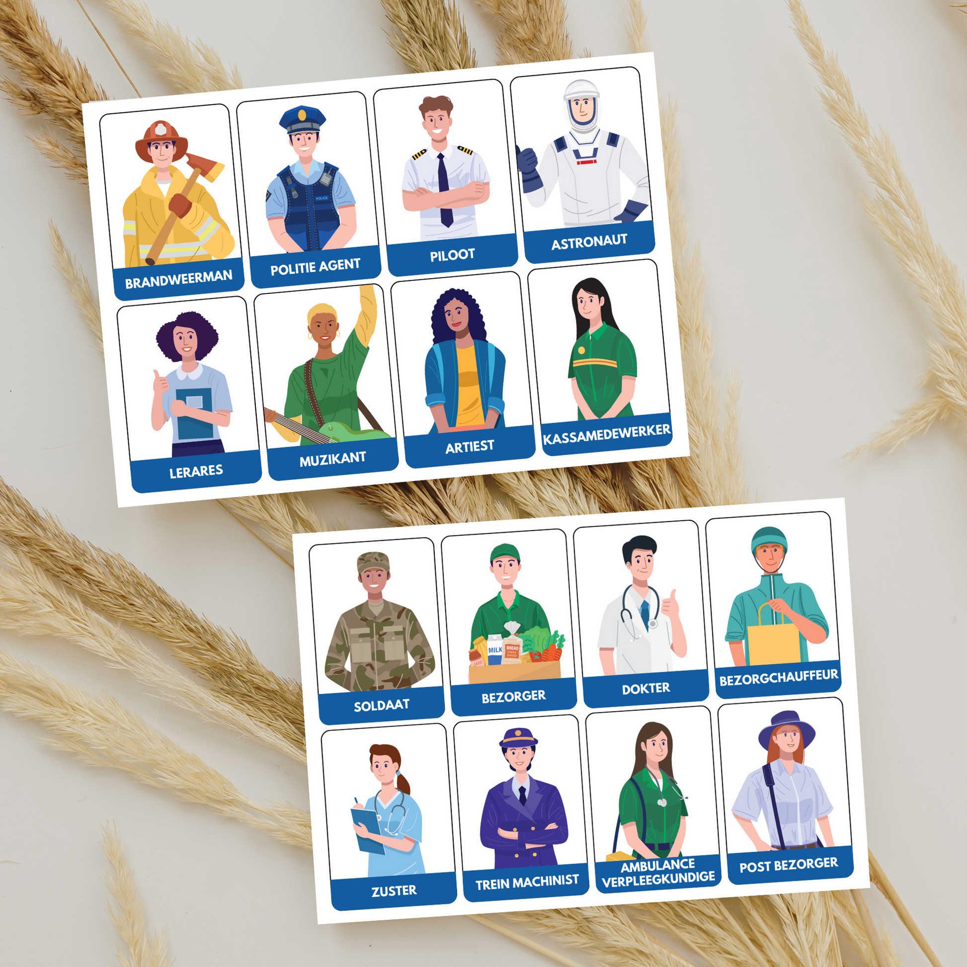 Onze kleurrijke beroepen-flashkaarten zijn speciaal ontworpen voor nieuwsgierige peuters en kleuters van 2 tot 6 jaar. Elke kaart toont een herkenbare illustratie van een beroep.