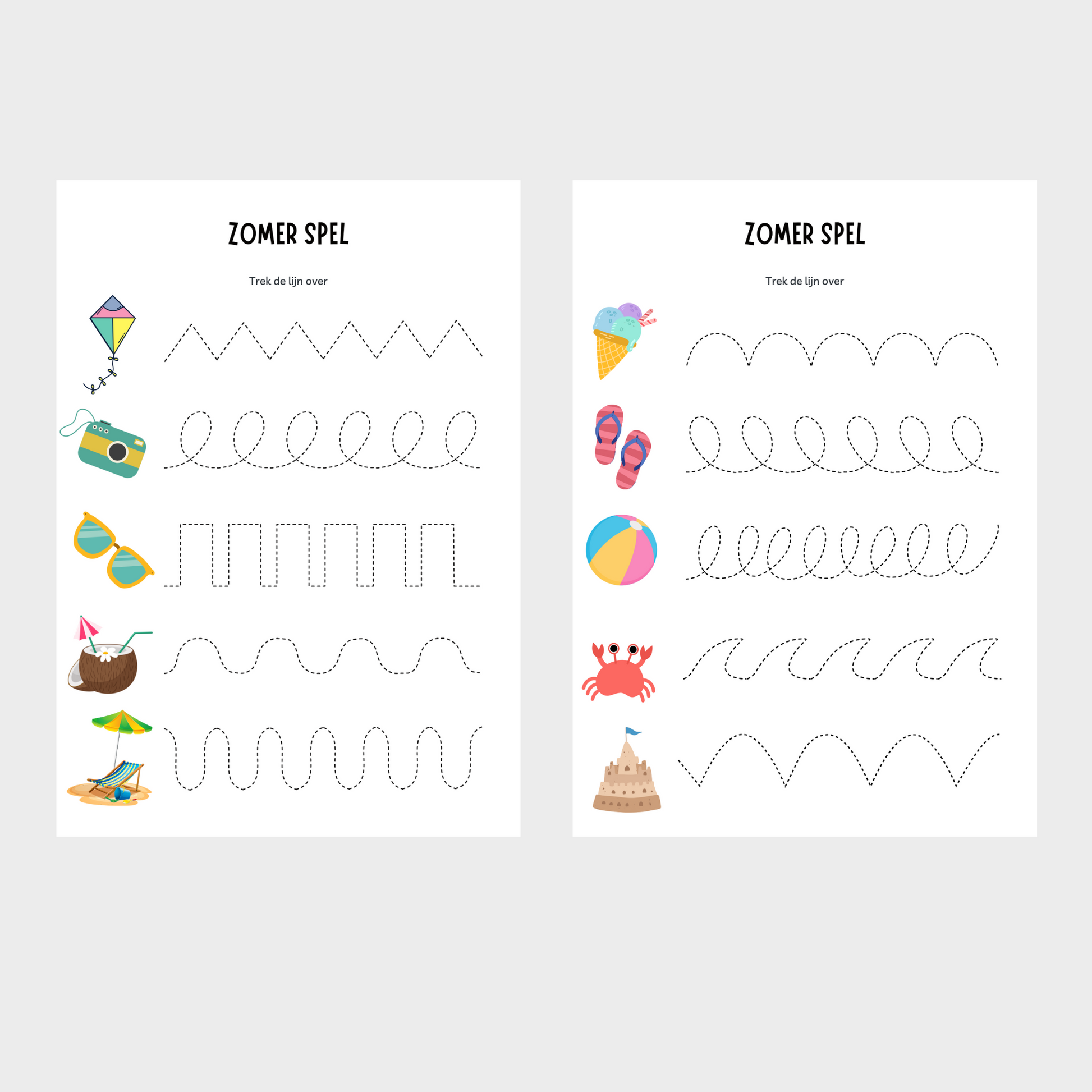 Oefen spelenderwijs de fijne motoriek met deze zomerse traceeroefening! Kinderen volgen kronkelige lijnen met een potlood of stift â ideaal als voorbereiding op schrijven.
